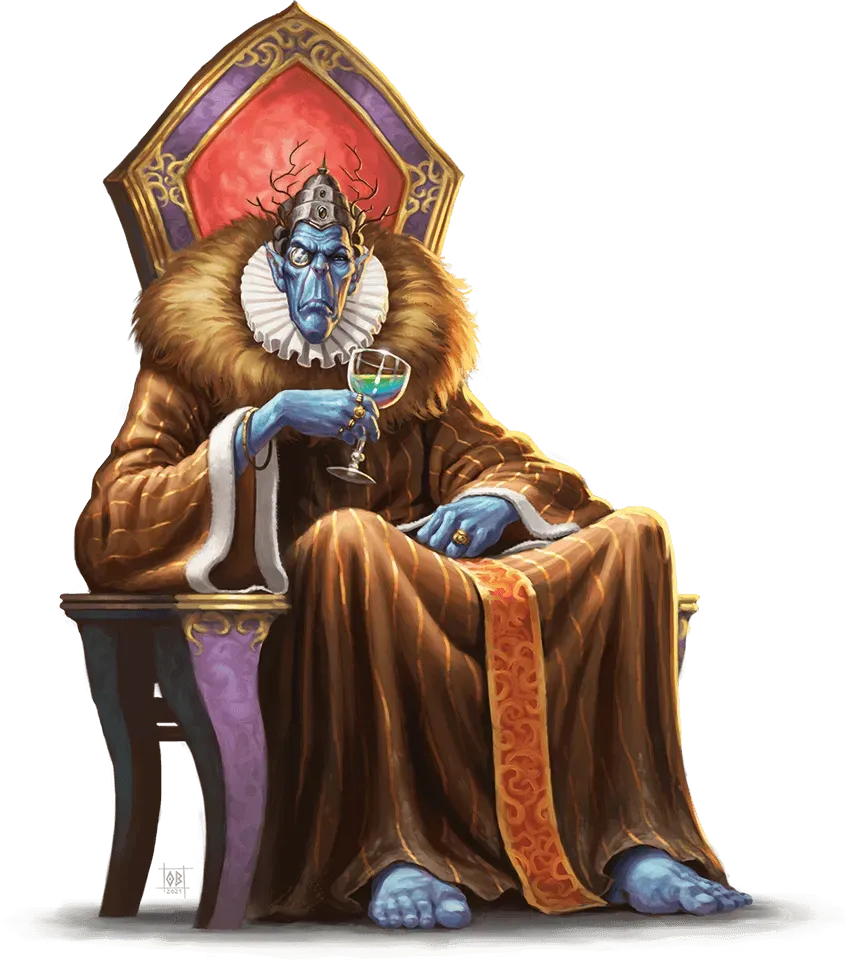 Sul trono, Vocath. Vesti eleganti, corporatura esile, pelle azzurra, espressione di chi aspetta che la conversazione arrivi al punto.