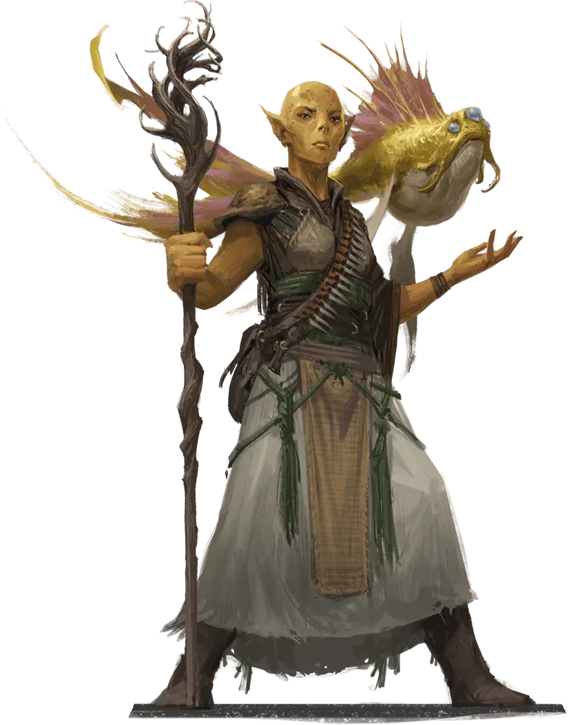 Ai suoi lati: Y’thraka, githyanki con una benda sull’occhio che sorride con un entusiasmo ingiustificato, e il Sergente Burt Fluke, giff ricoperto di cicatrici che sembra sul punto di scattare a ogni movimento del gruppo.