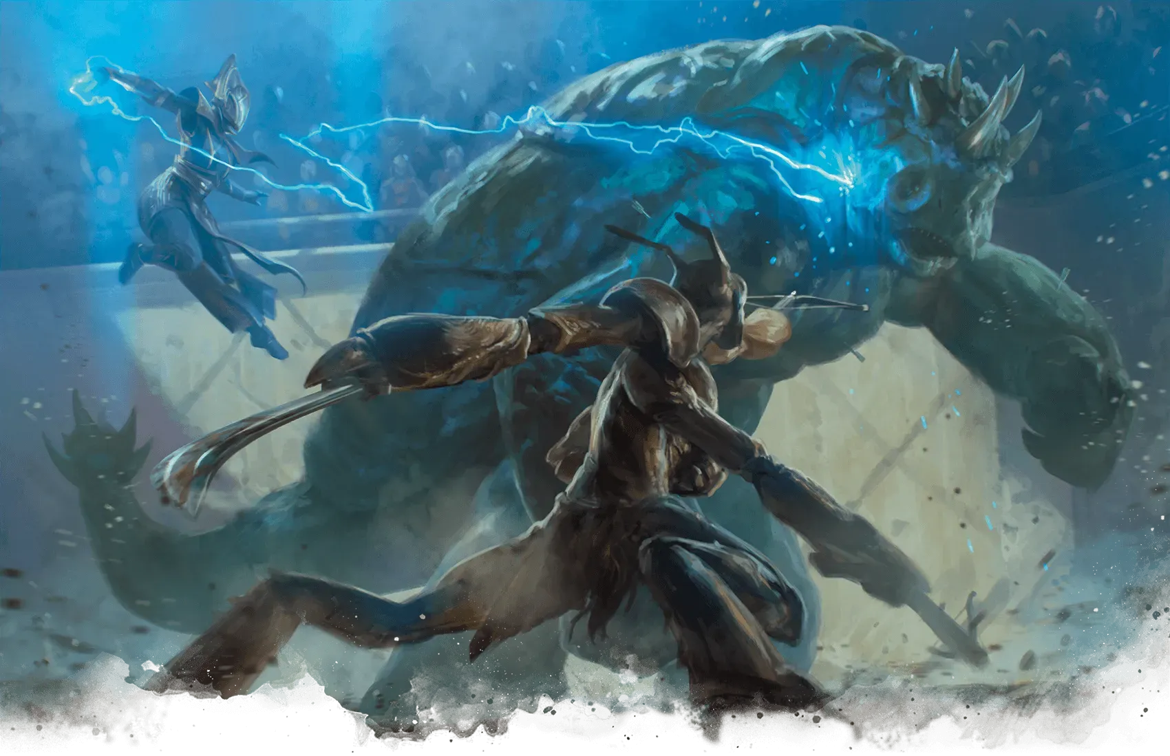 Il braxat materializza con due scavver già pronti sulle spalle. Lo scudo psionico assorbe i primi colpi del gruppo senza cedere. Il soffio d’acido rimbalza sull’arena. Uno scavver — il più grosso — si avventa su Warwyck e i due ingaggiano il loro combattimento laterale. L’altro si lancia su Hyppolita, che lo infilza al volo con l’alabarda prima che tocchi terra.