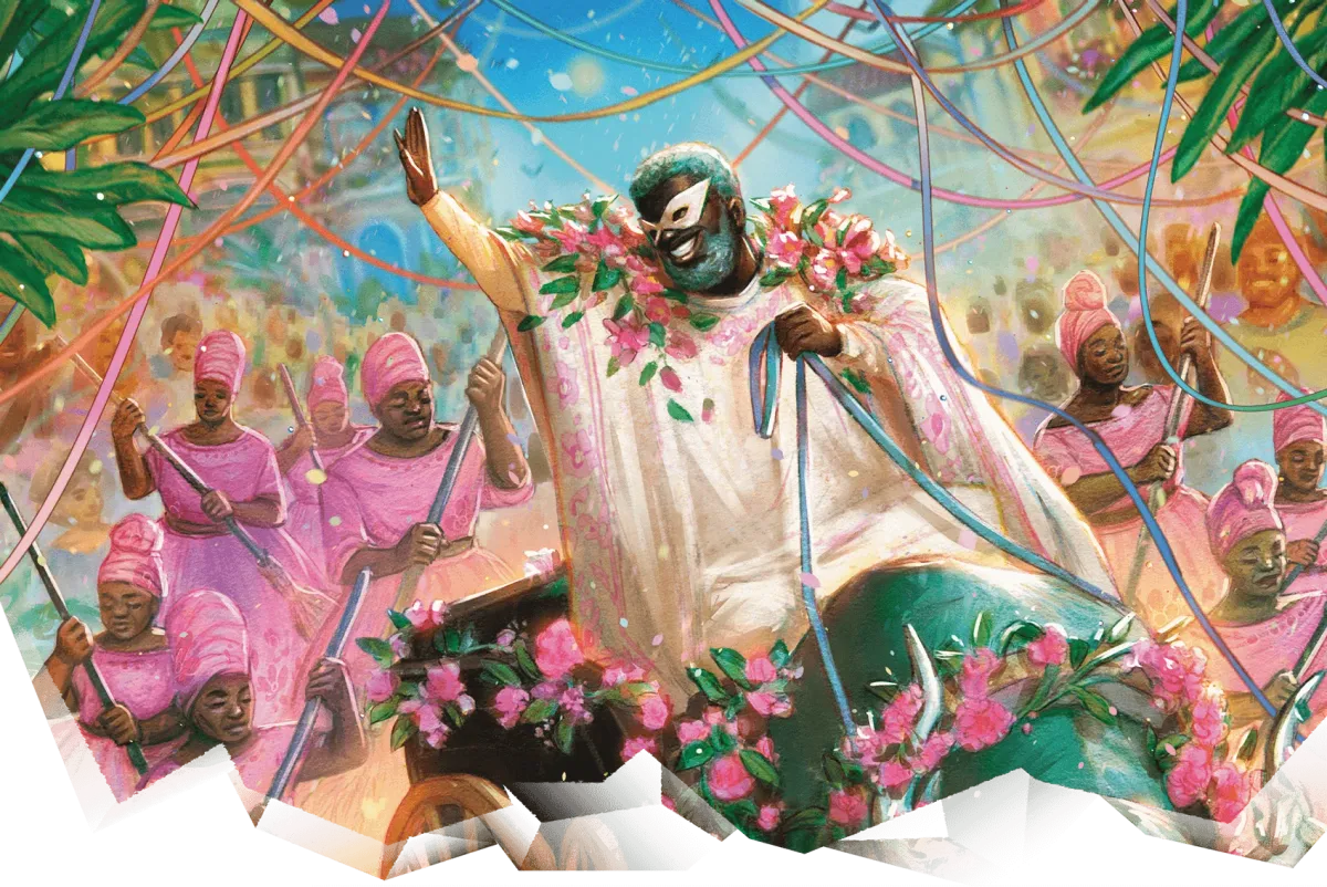 Il carro del Principe del Vizio, Azra Nir, avanza tra la folla, trainato da un bue imponente e circondato da guardie mascherate. All’altezza del molo, la situazione esplode: le pietre si spezzano, radici e rampicanti emergono dal suolo bloccando il carro. Una nube rosa invade l’aria. Festaioli barcollano, le guardie perdono il controllo, la folla si trasforma in fuga.