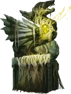 Il cammino porta a un tempio in rovina: lo Zenit del Dolore. Una statua antica di bakunawa giace spezzata, coperta da vesciche spirituali che pulsano come se respirassero.