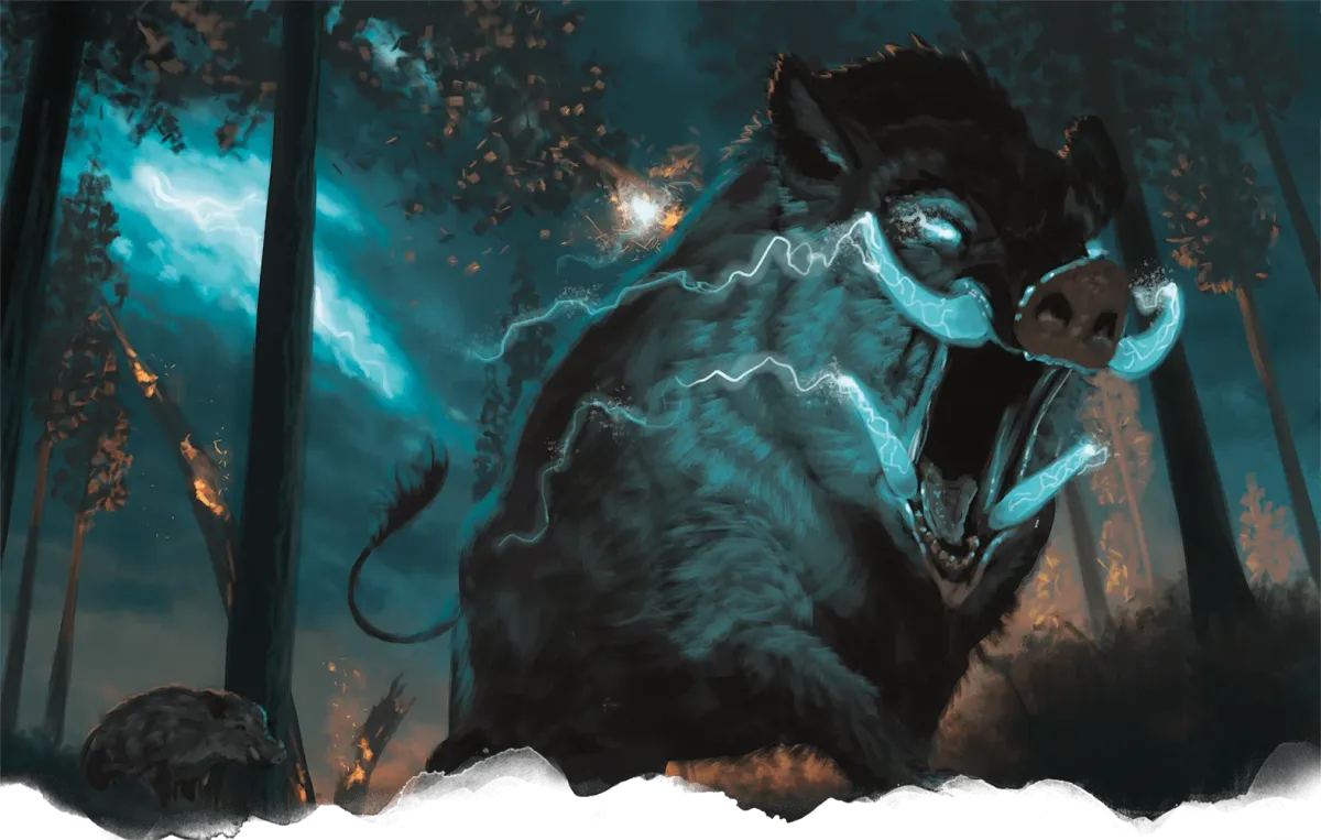 Dal cuore del temporale emerge Gorthok — incarnazione vivente della furia di Talos. Un cinghiale mastodontico avvolto in scariche elettriche, il cui corpo spezza strutture e travolge difese con una forza che non appartiene alla natura.