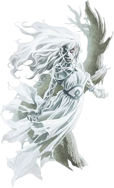 Le torce si spengono una dopo l’altra man mano che il gruppo avanza. Dietro un angolo, in un corridoio ormai completamente buio, si manifesta Vyldara. Un tempo ambasciatrice elfica, poi tradita e uccisa — ora intrappolata tra rabbia e dolore. La sua forma spettrale oscilla tra bellezza perduta e orrore puro.