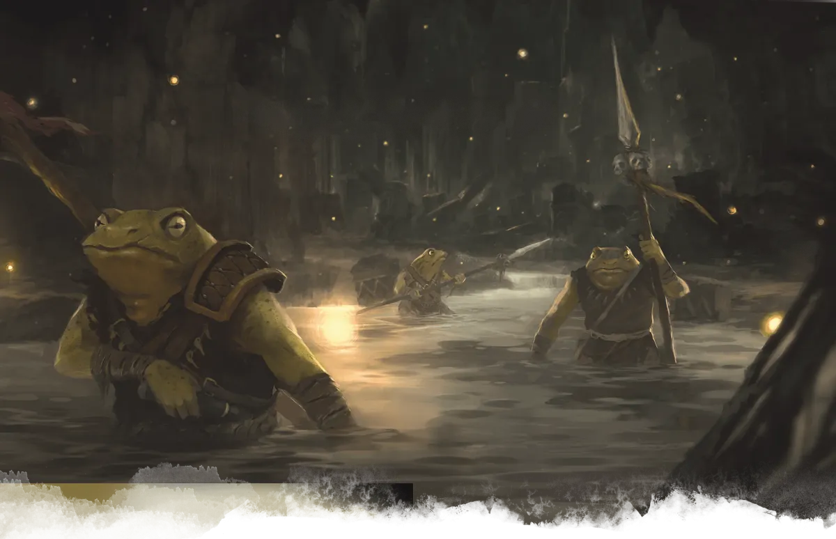 I bullywug osservano dalle ombre, armati e diffidenti. Gniomio riesce a comunicare con loro, ottenendo un passaggio verso l’isola sacra, cuore del loro dominio.