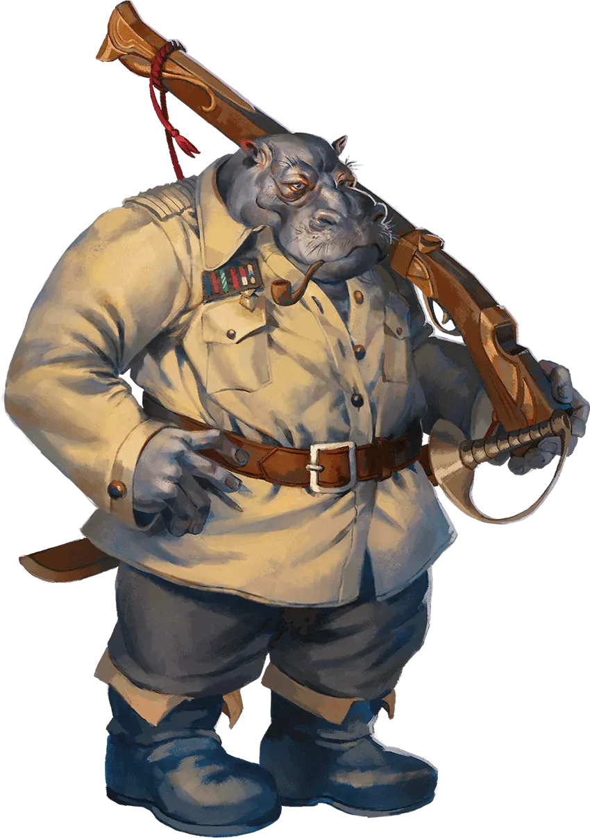 Poi il sottobosco davanti a loro esplode verso i lati e ne esce un giff in uniforme — tozzo, massiccio, la giacca stracciata in due punti, gli occhi spalancati in un’espressione che mescola adrenalina e calcolo. Stringe con entrambe le mani un lungo bastone dalla forma strana, con un’apertura scura a un’estremità. Lo gira verso la direzione da cui è venuto senza fermarsi e spara — due colpi in rapida successione, il riverbero che rimbalza tra gli alberi — poi riprende a correre.
