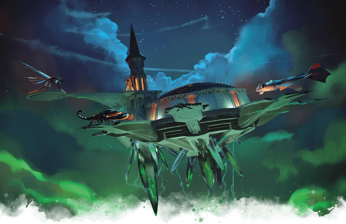 Pietra grigio-nera su nuvole di un verde bioluminescente. Formazioni cristalline che pendono dalla parte inferiore come stalattiti artificiali. Una cupola di cristallo al centro. Otto banchine che si irradiano verso il vuoto come raggi, quattro navi attraccate ai lati. E in cima alla torre privata, due statue alte dodici metri che ritraggono un gigante snello, elegante, ben vestito — la stessa figura, due volte, in pose leggermente diverse.