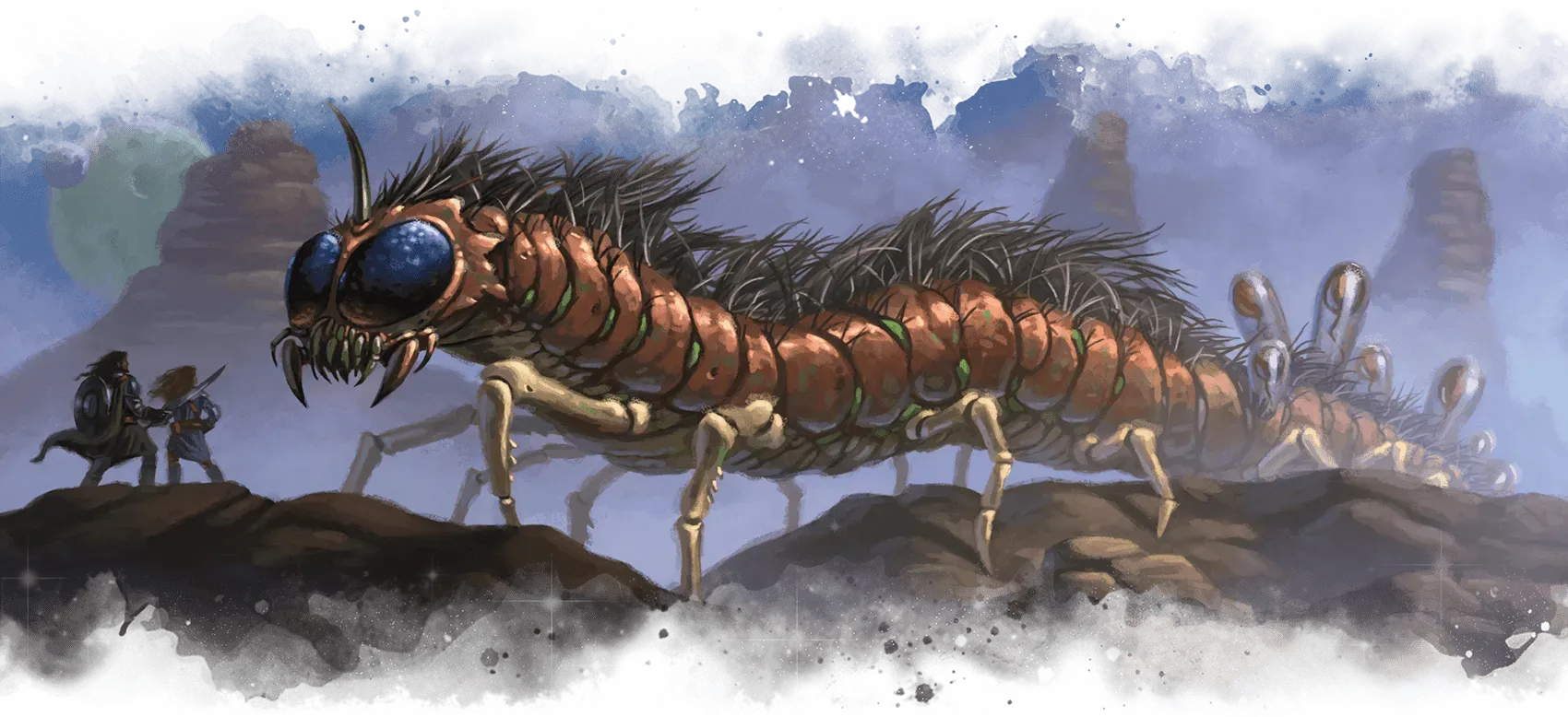 Ai suoi lati: Y’thraka, githyanki con una benda sull’occhio che sorride con un entusiasmo ingiustificato, e il Sergente Burt Fluke, giff ricoperto di cicatrici che sembra sul punto di scattare a ogni movimento del gruppo.