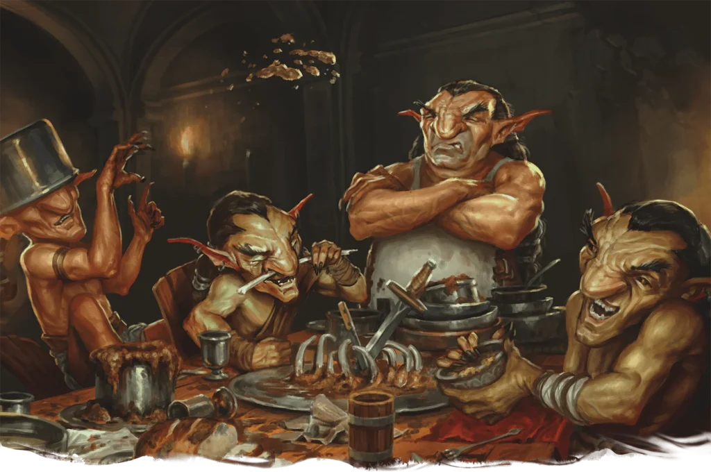 Dopo aver eliminato una sentinella hobgoblin, gli avventurieri osservano il campo: un ogre, quattro hobgoblin e un orco che impartisce ordini.