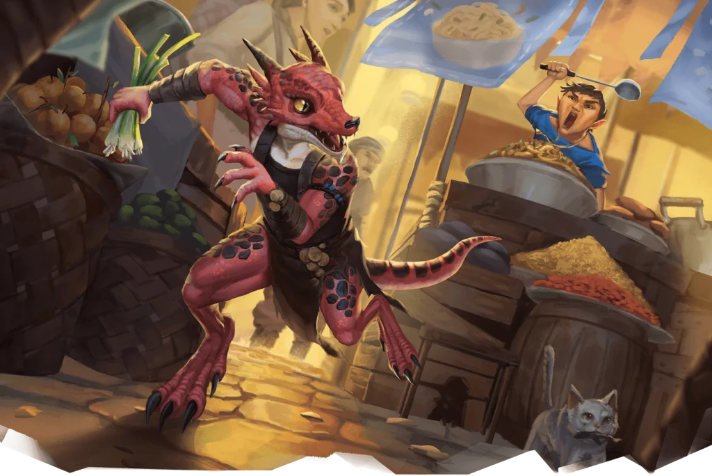 Lamai Tyenmo, venditrice di tagliolini, trascina al centro del mercato Gammon Xungoon, un giovane coboldo accusato di aver rubato cipollotti dalla sua bancarella.