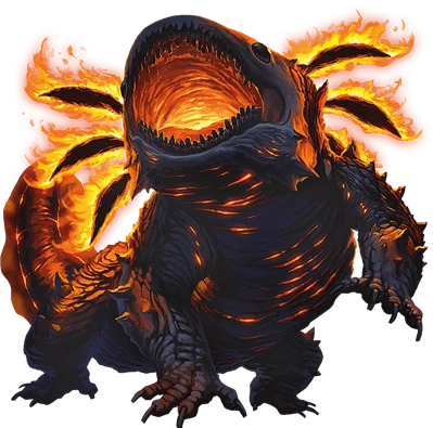 Dal bagliore del magma emerge Xocopol, un enorme gigante del fuoco.