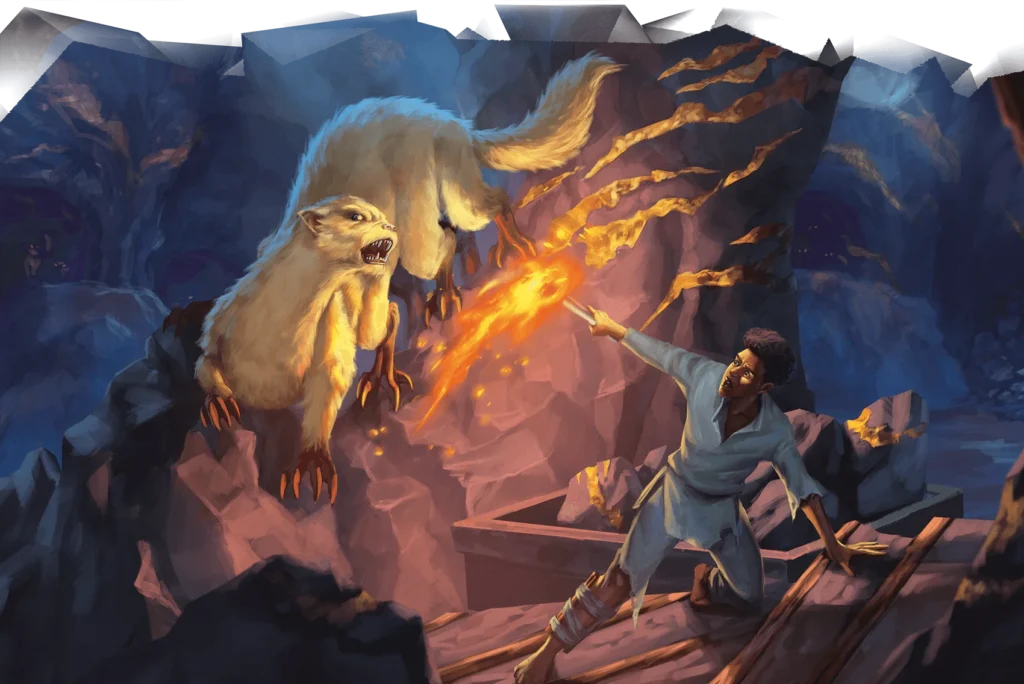 La discussione si accende quando una donna nana, corpulenta e sporca di polvere d’oro, si apre un varco tra la gente. È Uzoma Baten, sovrintendente della miniera. Parla senza cerimonie: sette minatori sono intrappolati, un superstite è fuggito parlando di una creatura, e serve aiuto immediato.
