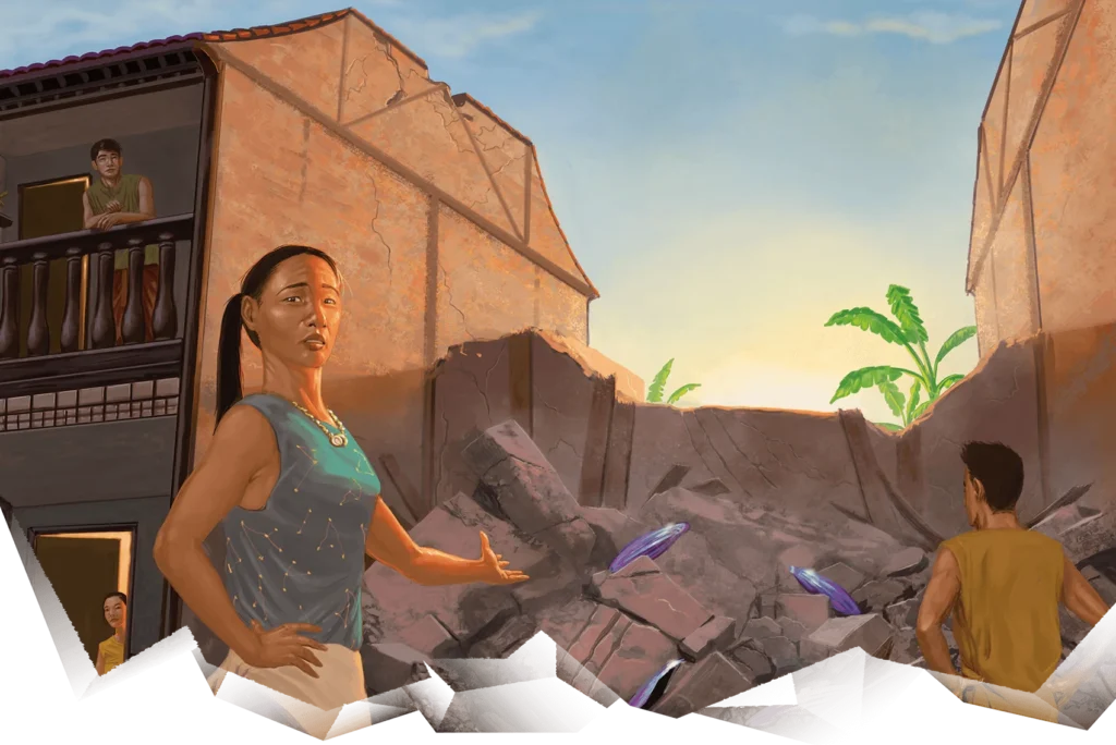 Il viaggio verso Kalapang è tranquillo finché non compaiono colonne di fumo. Una casa è crollata, feriti giacciono tra le macerie, la gente fugge urlando: il bakunawa è passato poche ore prima.