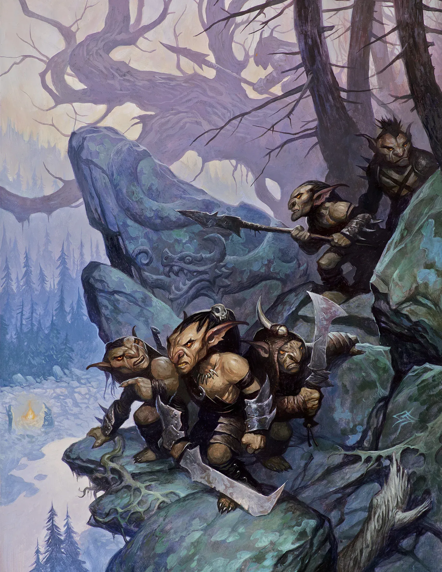 Le tracce conducono verso una serie di colline boscose. Dopo alcune ore, gli avventurieri individuano l’ingresso di una caverna nascosta, sorvegliata da una vedetta goblin.