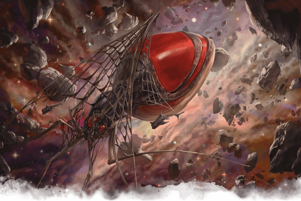 Mentre il gruppo rientra verso le rispettive navi, una nuova sagoma emerge oltre il campo di asteroidi: un vascello dalla forma di un gigantesco ragno, zampe ricurve e corpo centrale massiccio, lanciato a tutta forza verso di loro.