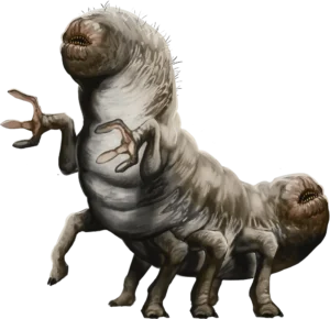 Dalla cima della scala compaiono quattro creature. Corpi vermiformi, segmentati, privi di arti veri e propri. La pelle è umida, tesa su una muscolatura sottile che si contrae con movimenti a scatto. La testa è larga e appiattita, dominata da una bocca circolare irta di piccoli denti concentrici.